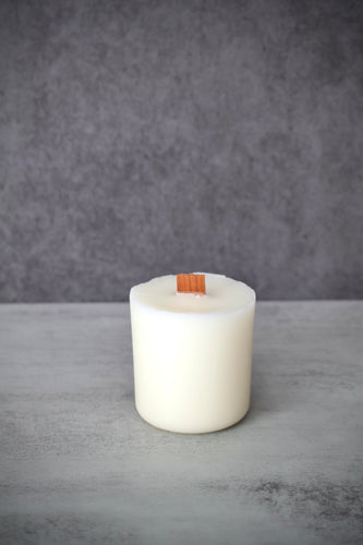 cinnamon and lemon, coconut apricot wax luxury candle. Made with a sustainably-sourced wooden wick,  no harmful toxins or chemicals, not tested on animals.